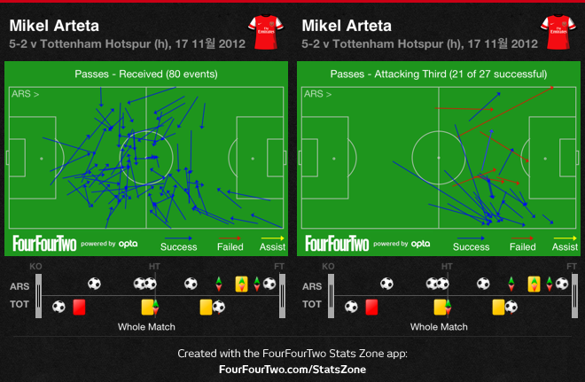 경기가 끝날때까지 아르테타는 미드 전지역을 자유롭게 돌아다니면서 공격의 맥을 끊기지 않게 이어갔고, 카졸라는 계속 측면으로 이동하면서, 부분적인 수적 우위를 만들면서, 토트넘 3백의 측면 공간에 계속해서 침투하고 공을 뿌려댔습니다.