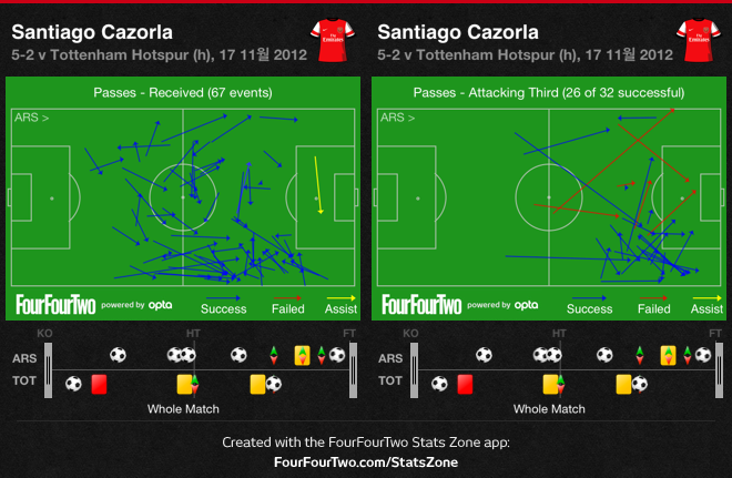 하나는 윌셔의 재기넘치는 터닝으로 순식간에 토트넘의 수비라인을 박스근처까지 밀어내 버렸죠. 그 직후 카졸라가 오른쪽 측면으로 이동하면서 부분적으로 수적 우위를 만들고, 멋진 스루패스를 하면서 분위기를 한번 움켜잡는데 성공했습니다.