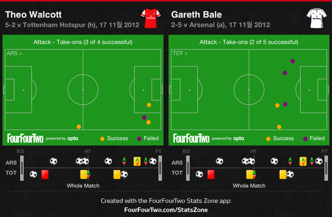 베일의 치고 달리기가 매우 임팩트 있게 느껴지지만, 드리블의 성공율과 안정성 면에서는 월콧이 더 좋은 평가를 받을 수 있을 것입니다.